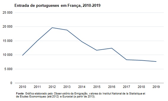 Fonte: Vidigal, Inês (2021), “Entradas de portugueses em França voltam a diminuir em 2019”, Observatório da Emigração. http://observatorioemigracao.pt/np4/7961.html